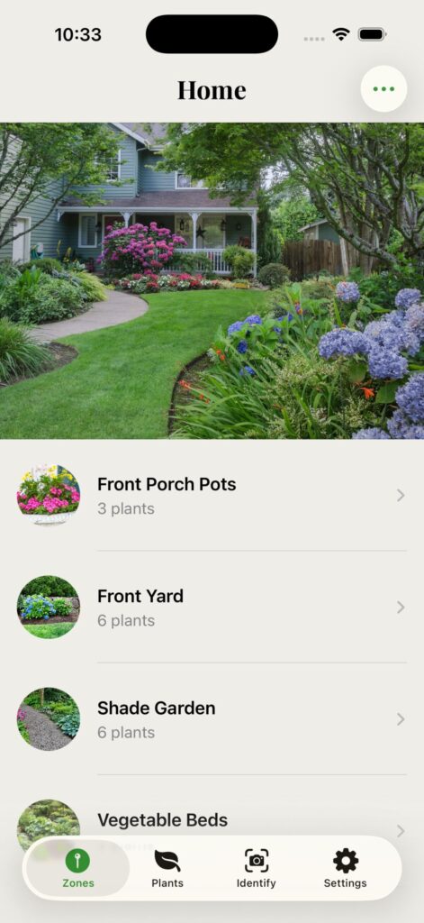 How it works: Properties are your gardens — your home, a community plot, a friend’s yard you help tend. Zones are the sections within them — the vegetable bed, the shade garden, the front porch containers. Plants live inside zones, each with its own photos, planting date, and notes.